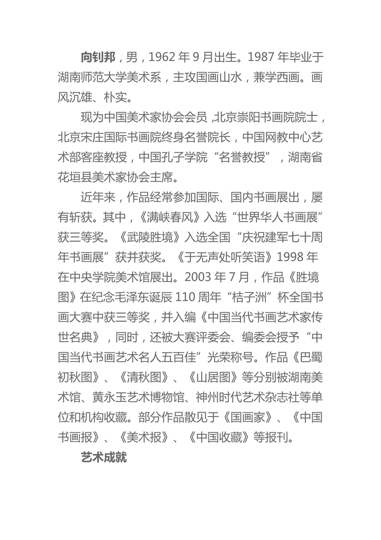 向钊邦,男,1962年9月出生。1987年毕业于湖南师范大学美术系,主攻国画山水,兼学西画。画风沉雄、朴实。