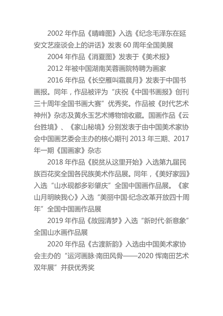 2016年作品《长空雁叫霜晨月》发表于中国书画报。同年,作品被评为“庆祝《中国书画报》创刊三十周年全国书画大赛”优秀奖。作品被《时代艺术神州》杂志及黄永玉艺术博物馆收藏。国画作品《云台胜境》、《家山秘境》分别发表于由中国美术家协会中国画艺委会主办的核心期刊2013年三期、2017年一期《国画家》杂志